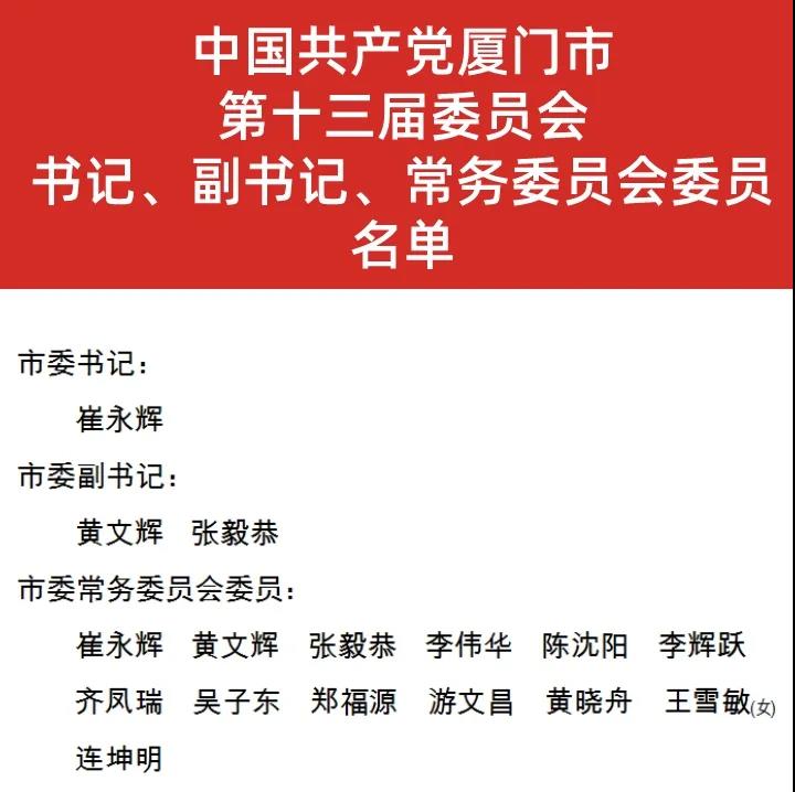 全會以無記名投票方式,選舉崔永輝、黃文輝、張毅恭、李偉華、陳沈陽、李輝躍、齊鳳瑞、吳子東、鄭福源、遊文昌、黃曉舟、王雪敏、連坤明為市委常委;選舉崔永輝為市委書記,黃文輝、張毅恭為市委副書記。全會通過了中國共產黨廈門市第十三屆紀律檢查委員會第一次全體會議選舉結果的報告。