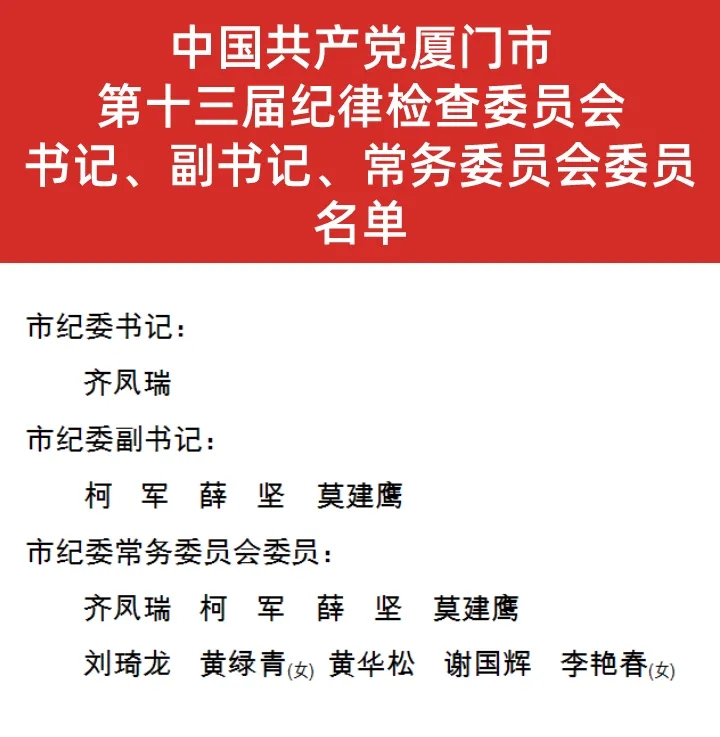 廈門網訊(廈門日報記者 何無痕 製圖 施璐瑋)11月7日(ri)上(shang)午(wu),中(zhong)國(guo)共(gong)產(chan)黨(dang)廈(sha)門(men)市(shi)第(di)十(shi)三(san)屆(jie)紀(ji)律(lv)檢(jian)查(zha)委(wei)員(yuan)會(hui)第(di)一(yi)次(ci)全(quan)體(ti)會(hui)議(yi)召(zhao)開(kai)。本(ben)次(ci)會(hui)議(yi)選(xuan)舉(ju)產(chan)生(sheng)了(le)中(zhong)共(gong)廈(sha)門(men)市(shi)第(di)十(shi)三(san)屆(jie)紀(ji)律(lv)檢(jian)查(zha)委(wei)員(yuan)會(hui)常(chang)務(wu)委(wei)員(yuan)會(hui)委(wei)員(yuan)和(he)書(shu)記(ji)、副書記。齊鳳瑞當選為市紀委書記,柯軍、薛堅、莫建鷹當選為市紀委副書記。齊鳳瑞、柯軍、薛堅、莫建鷹、劉琦龍、黃綠青(女)、黃華鬆、謝國輝、李豔春(女)當選為市紀委常務委員會委員。齊鳳瑞同誌主持會議並作講話。