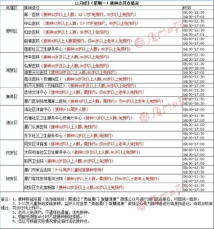 廈門網訊(廈門日報記者陳蓴)明天(11月8日),廈門有22個接種點為市民提供疫苗接種服務。接種新冠疫苗(含加強免疫)需通過“美麗廈門智慧健康”微信公眾號預約,或由單位、村居統一組織。