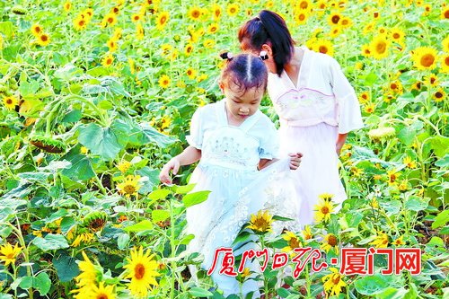 “來,你慢慢地走進花田,媽媽給你拍照,不要踩到花哦。”shiminjinnvshijingxinzhidaobingpaixianveryuxiangrikuiyiqidemeihaoshunjian。yipangdeqinglvyexieshouzoujinhuatian,zhanzaixiangrikuihuacongzhongtianmiheying。zhiwuyuangongzuorenyuangaosujizhe,xiangrikuihuaqijijiangjieshu,shiminyaojinzaolaishangjing。