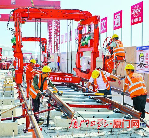 11月6日,記者走進位於蔡厝附近的軌道交通4號線4號鋪軌基地,這裏一派繁忙的施工景象:龍門吊的“鐵爪”合(he)力(li)抓(zhua)起(qi)已(yi)經(jing)組(zu)裝(zhuang)好(hao)的(de)軌(gui)排(pai),從(cong)地(di)麵(mian)吊(diao)運(yun)到(dao)道(dao)床(chuang)上(shang),用(yong)於(yu)地(di)鐵(tie)鋪(pu)軌(gui)。身(shen)穿(chuan)反(fan)光(guang)背(bei)心(xin)的(de)工(gong)人(ren)分(fen)工(gong)明(ming)確(que),有(you)的(de)操(cao)作(zuo)鋪(pu)軌(gui)機(ji)進(jin)行(xing)鋪(pu)軌(gui)作(zuo)業(ye),有(you)的(de)進(jin)行(xing)綁(bang)紮(zha)鋼(gang)筋(jin)作(zuo)業(ye)……施工現場負責人告訴記者,當前,距離年底已不足百日,全體參建人員將勠力同心,奮戰搶工,確保如期完成全年目標。
