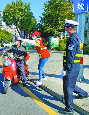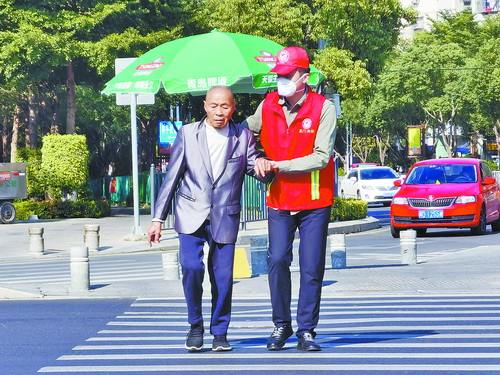 誌願者扶老人過馬路。