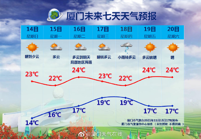 另據廈門天氣在線微博消息,未來7天冷空氣活動頻繁,廈門氣溫來回波動,今天白天晴到少雲,氣溫18~23℃,傍晚開始氣溫逐漸降低,預計在15~18℃左右。早晚溫度變化不大,但夜晨相對較涼,還是要多注意,別感冒了。