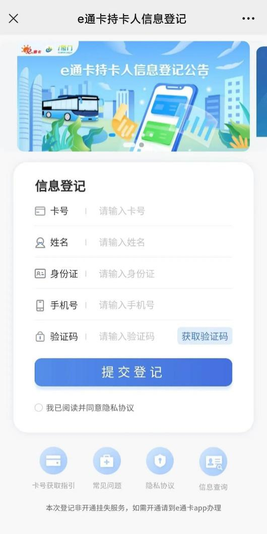按要求填寫e通卡卡號、姓名、身份證、手機號、驗證碼,勾選“我已閱讀並同意隱私協議”,提交登記即可。