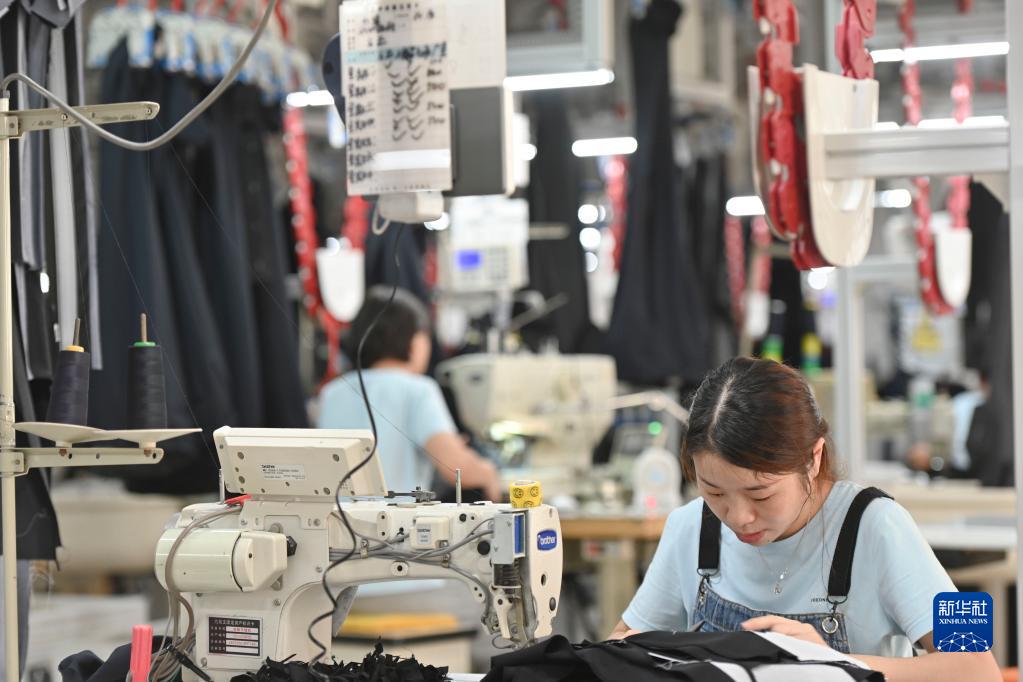 在位於福建省泉州市經濟技術開發區的九牧王西褲智能化生產車間,工人在自動化西褲吊掛流水線上作業(7月30日攝)。新華社記者宋為偉攝