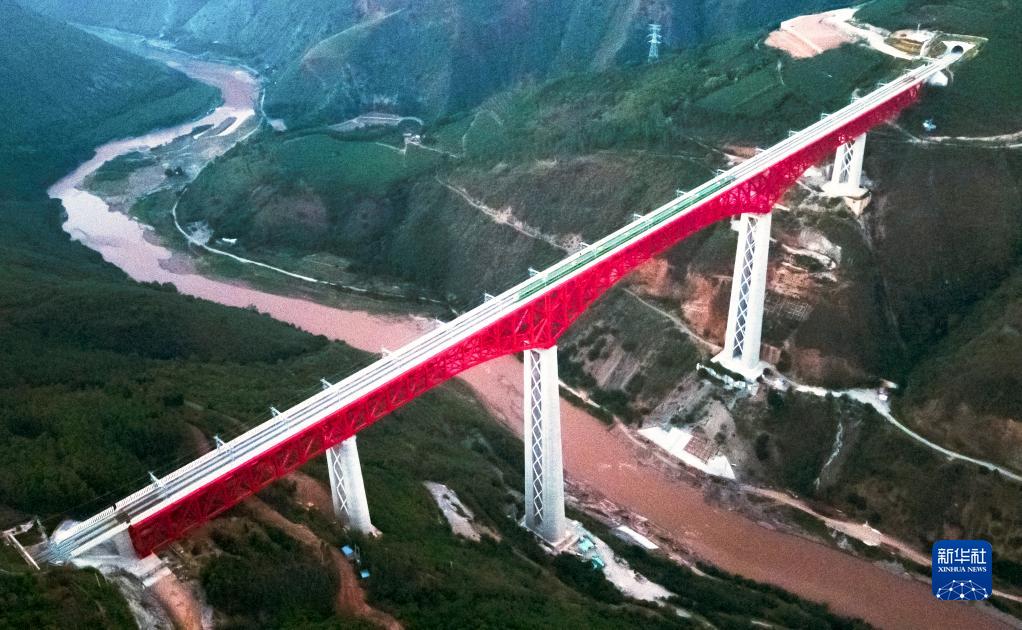 中老鐵路首發列車駛過中國雲南省元江哈尼族彝族傣族自治縣境內的元江雙線特大橋(12月3日攝,無人機照片)。新華社記者王冠森攝