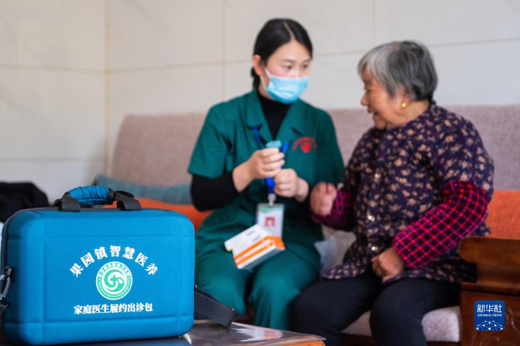 11月12日,在湖南省長沙市長沙縣果園鎮楊泗廟社區,醫務人員劉敏指導居家老人用藥。新華社記者陳思汗攝