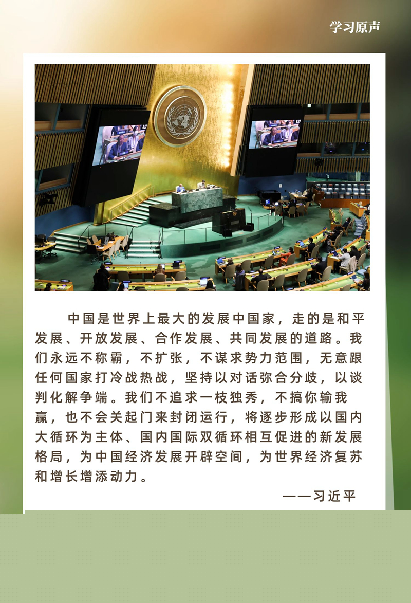 大(da)道(dao)之(zhi)行(xing),天(tian)下(xia)為(wei)公(gong)。和(he)平(ping)與(yu)發(fa)展(zhan)是(shi)時(shi)代(dai)主(zhu)題(ti),也(ye)是(shi)不(bu)可(ke)抗(kang)拒(ju)的(de)曆(li)史(shi)潮(chao)流(liu)。中(zhong)國(guo)將(jiang)堅(jian)定(ding)站(zhan)在(zai)曆(li)史(shi)正(zheng)確(que)的(de)一(yi)邊(bian),站(zhan)在(zai)人(ren)類(lei)進(jin)步(bu)的(de)一(yi)邊(bian),同(tong)世(shi)界(jie)各(ge)國(guo)攜(xie)手(shou)並(bing)肩(jian),向(xiang)著(zhe)構(gou)建(jian)人(ren)類(lei)命(ming)運(yun)共(gong)同(tong)體(ti)光(guang)明(ming)未(wei)來(lai)不(bu)斷(duan)前(qian)進(jin)。