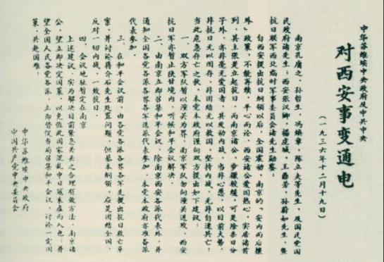 1936年12月19日,中華蘇維埃中央政府和中共中央發表主張和平解決西安市事變的《通電》。