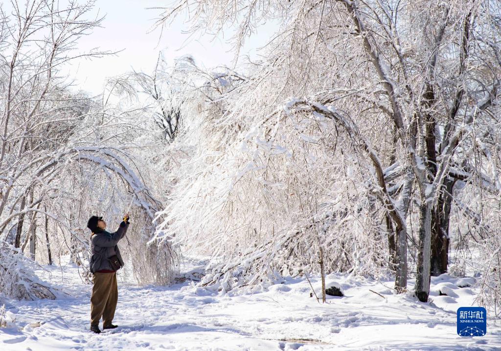 11月12日,在哈爾濱市太陽大道附近,一市民在結滿冰晶的樹前拍照。