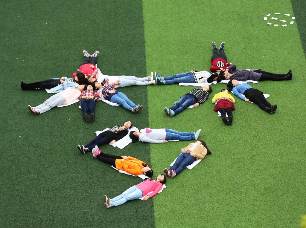 圖為湖南南華大學護理學院的誌願者在學校足球場舉行“睡入夢鄉”行為藝術