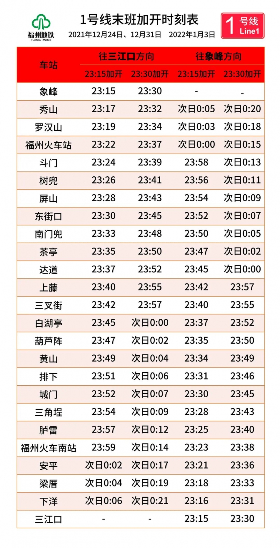 1號線將於正常運營結束後,23時15分、23時30分從象峰和三江口各加開一列載客列車。