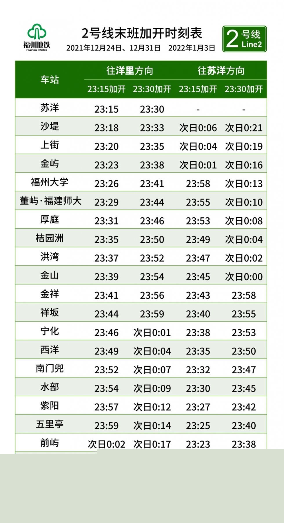 2號線將於正常運營結束後,23時15分、23時30分從蘇洋和洋裏各加開一列載客列車。