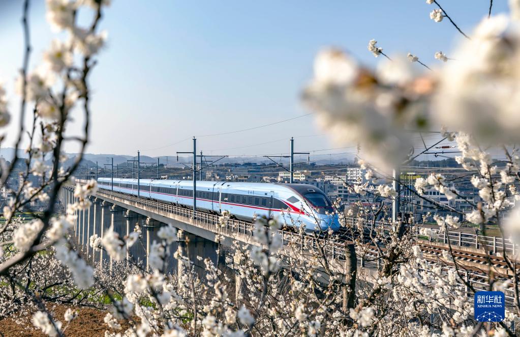 動車組列車在成貴高鐵貴州黔西段行駛(2022年3月7日攝)。新華社發(範暉攝)