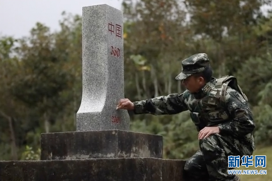 張俊擦拭界碑(資料圖)新華網發。(天保出入境邊防檢查站供圖)