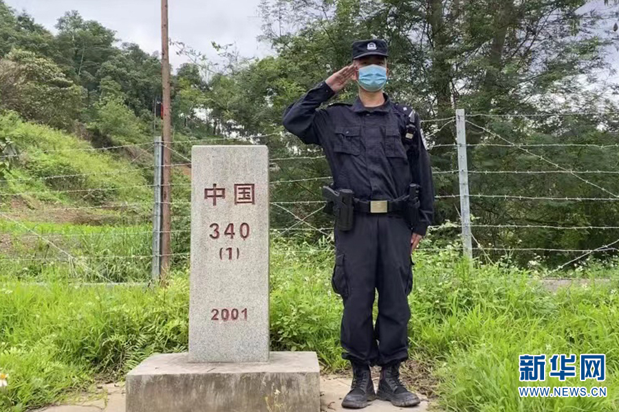 張俊巡邏途中與界碑合影(資料圖)新華網發。(天保出入境邊防檢查站供圖)