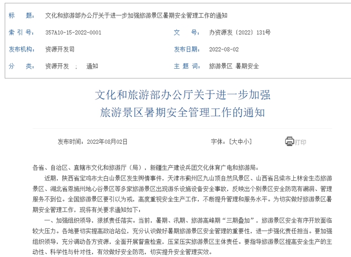文旅部網站2日發布《文化和旅遊部辦公廳關於進一步加強旅遊景區暑期安全管理工作的通知》(以下簡稱《通知》),《通知》稱,近期,陝西省寶雞市太白山景區發生輿情事件,天津市薊州區九山頂自然風景區、山西省呂梁市上林舍生態旅遊景區、湖北省恩施州地心穀景區等多家旅遊景區出現遊樂設施設備安全事故,反映出個別景區安全防範有漏洞、管理服務不到位。全國旅遊景區要引以為戒,高度重視安全生產工作,不斷提升管理和服務水平。