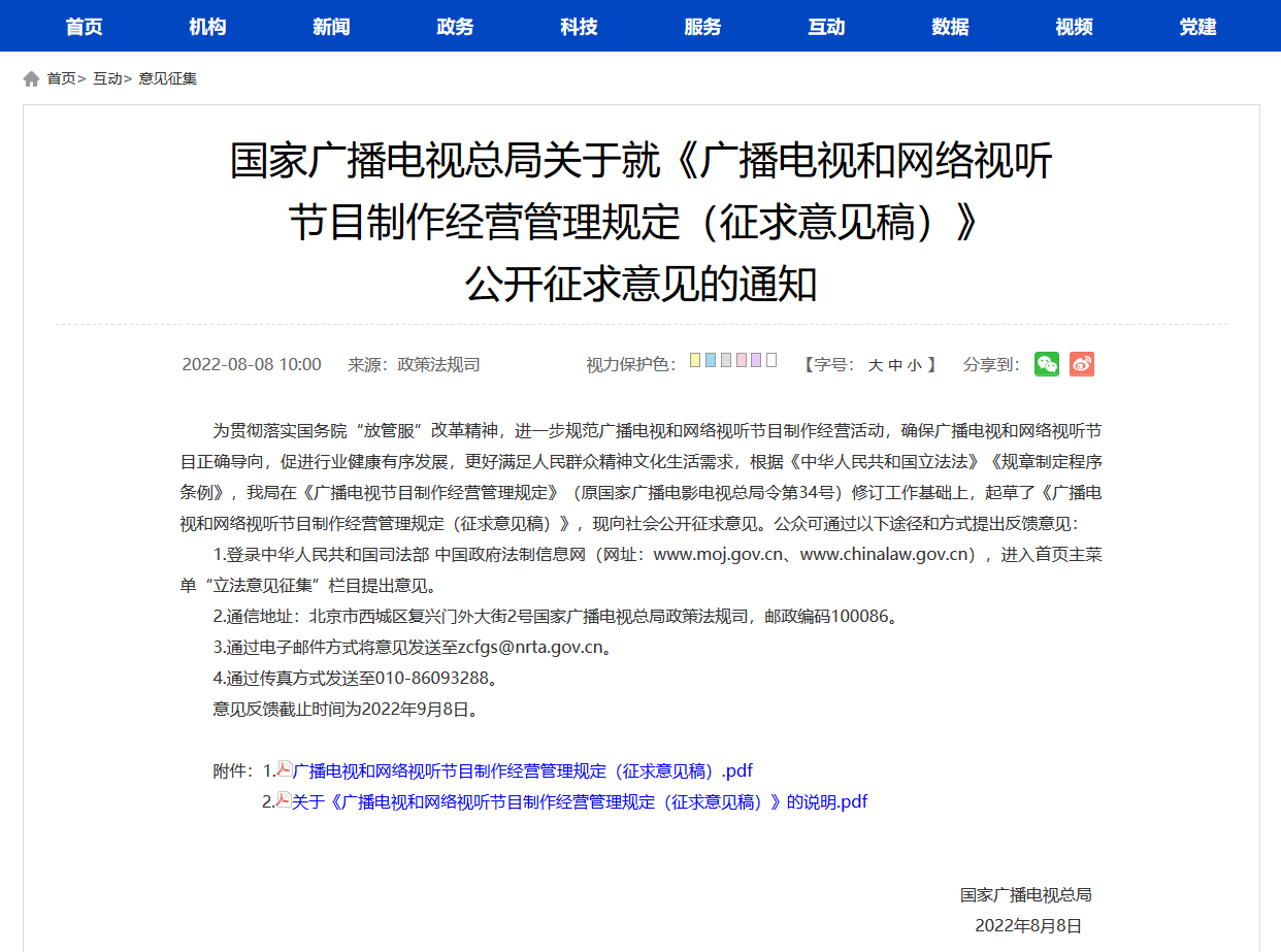 近日,國家廣播電視總局發布關於就《廣播電視和網絡視聽節目製作經營管理規定(征求意見稿)》公gong開kai征zheng求qiu意yi見jian的de通tong知zhi。主zhu要yao修xiu改gai體ti現xian在zai完wan善shan節jie目mu製zhi作zuo經jing營ying行xing為wei規gui範fan等deng方fang麵mian,包bao括kuo對dui於yu行xing業ye組zu織zhi及ji從cong業ye主zhu體ti提ti出chu了le自zi律lv要yao求qiu,完wan善shan節jie目mu禁jin載zai內nei容rong,增zeng加jia有you關guan片pian酬chou管guan理li規gui定ding,禁jin止zhi開kai展zhan收shou視shi率lv點dian擊ji率lv等deng方fang麵mian的de虛xu假jia宣xuan傳chuan等deng。