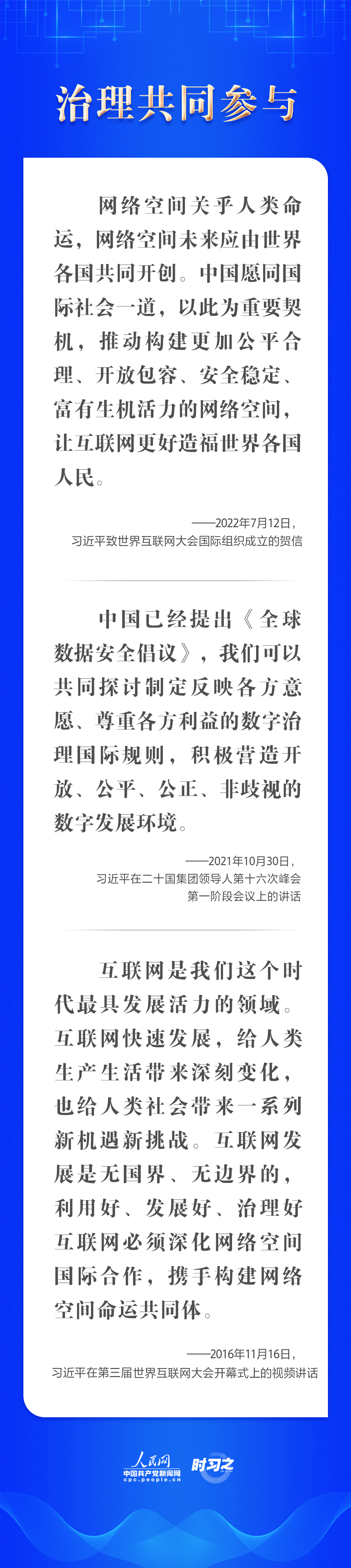 “網絡空間關乎人類命運,網絡空間未來應由世界各國共同開創。”中共中央總書記、國家主席、中央軍委主席習近平一直高度重視網絡強國建設,提出構建網絡空間命運共同體的重要理念,倡導“發展共同推進、安全共同維護、治理共同參與、成果共同分享”,讓互聯網更好造福世界各國人民。