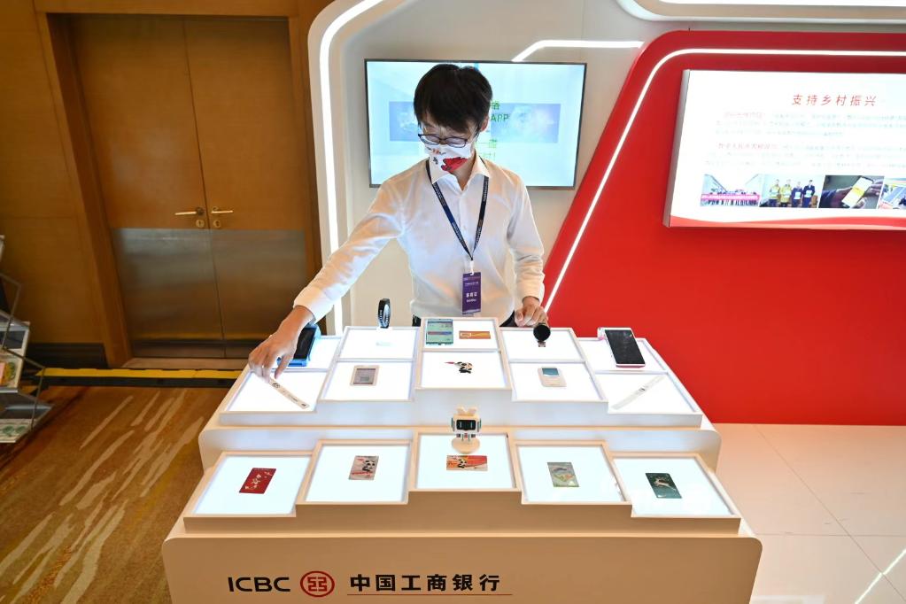 9月8日,在2022中國(北京)數字金融論壇設置的數字人民幣體驗區,工商銀行展台的工作人員擺放數字人民幣硬錢包產品。新華社記者李鑫攝