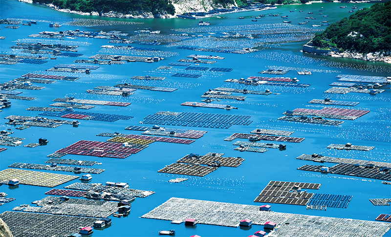 2022年8月15日,福建省連江縣奇達村連成片的漁排宛如一座“海上牧場”(無人機照片)。奇達村是一個集齊了“山、海、島、漁村”等元素的千年古村落,是天然的避風良港,適合養殖鮑魚、海帶等海產品。中新社記者王東明/攝