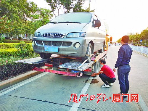 廈門網訊 (文/圖廈門日報記者 張玉榕) 昨日,廈門日報A04版報道了“僵屍車”問題後,當日上午11時許,新店交警中隊組織民警到相關區域實地排查,在翔安區新店街道南洋學院路段找到停放在公共停車位的“僵屍車”。minjingsuijilianxichezhudaochang,xianchanggaozhichezhuyouyuqichangqizhanyonggonggongcheweiyijingyingxiangdaocheweirichangshiyonggongneng,zelingqimashangzhenggai。jingguominjingyifanpipingjiaoyu,chezhurenshidaozijixingweidebutuo。zuorixiawu4時許,在民警的監督下,車主叫來拖車將車輛移走。
