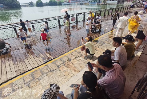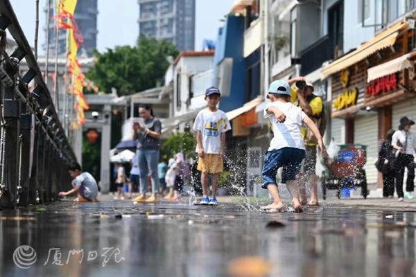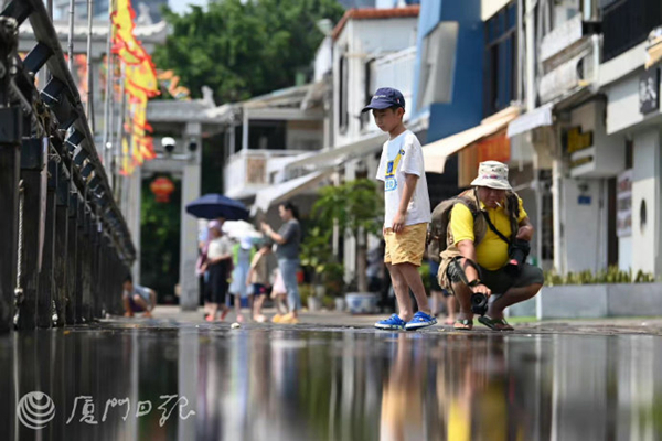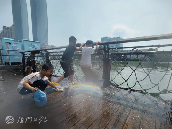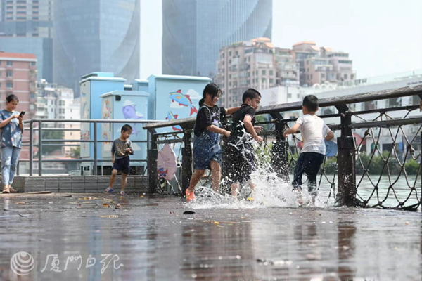 廈門網訊(廈門日報記者 張玉榕 林銘鴻)12日下午1時30分左右,記者來到沙坡尾避風塢,此時,木棧道部分路段已有海水漫上來,一時之間沙坡尾成了孩子們的“水上樂園”。不少小朋友有備而來,穿著拖鞋,扶著圍欄,興奮地踩著海水玩耍。海水濺起,孩子們樂得咯咯直笑。“玩差不多就得撤啦!可不要曬傷了!”正當孩子們玩得起勁時,還有不少家長躲在陰涼處塗抹防曬霜。