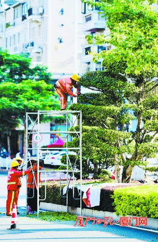 昨日天氣晴朗,養護工人在路邊修剪綠植。(廈門日報記者 張江毅攝)