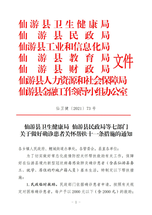 廈門網訊 據東南網報道(記者 盧建偉)11月9日,莆田市仙遊縣衛生健康局、縣民政局、縣工業和信息化局、縣教育局、縣財政局、縣人力資源與社會保障局、縣金融工作領導小組辦公室等7家單位聯合出台11條關於做好新型冠狀病毒感染肺炎確診患者關懷幫扶的措施,給在仙遊縣境內確診患者(含在仙遊縣務工、就學、居住的外地戶籍人員)基本生活提供有力保障,符合條件的家庭每戶最高可領上萬元。