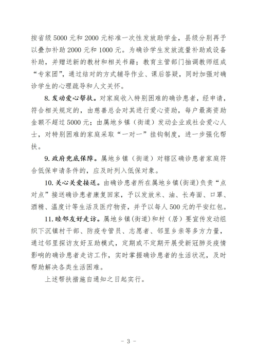 值得關注的是,民政部門依據確診患者申請,對困難確診患者每戶予以2000元以下(含2000元)的救助;對特別困難確診患者,經核實後,民政部門再予以每人2000元以下(含2000元)的救助,每戶最高不超過1萬元。慈善總會將對家庭收入特別困難的確診患者進行愛心幫扶,每戶最高資助金額不超過5000元。教育部門對因本人或直係親屬罹患重症(含危重症)和其他新型冠狀病毒肺炎導致家庭經濟困難的學生分別按省級5000元和2000元標準一次性發放助學金,縣級分別再予以疊加補助2000元和1000元。