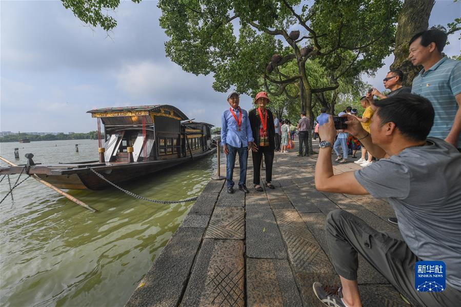 兩名老黨員在浙江嘉興南湖湖心島停泊的南湖紅船旁拍照(7月1日攝)。新華社記者徐昱攝