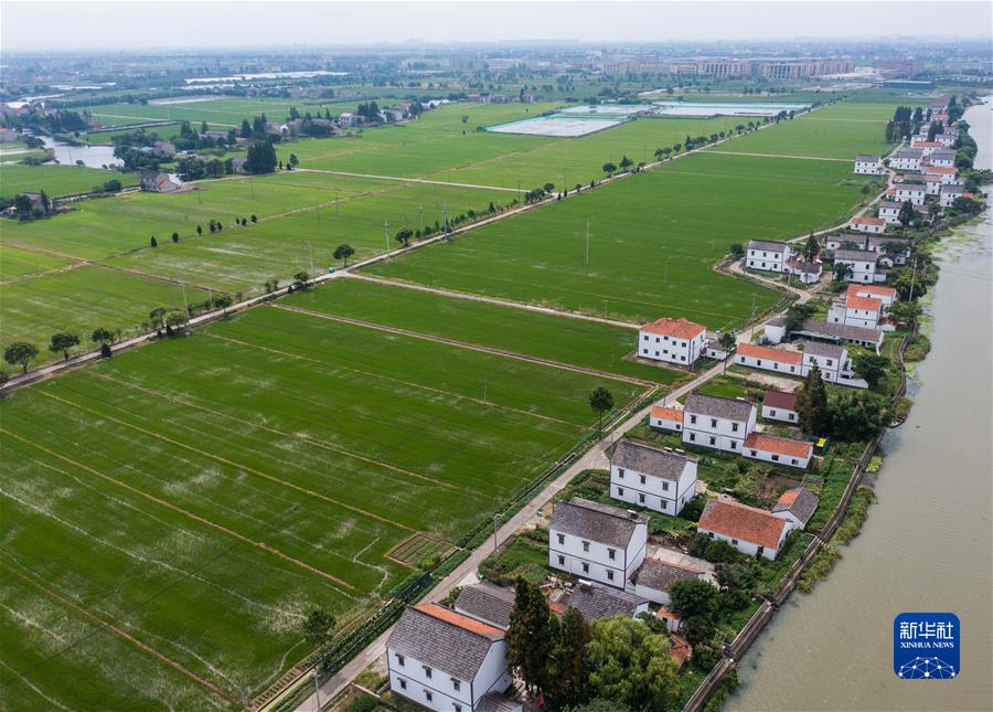 空中俯瞰浙江省嘉興市嘉善縣西塘鎮紅菱村的連片稻田和美麗村居(7月13日攝,無人機照片)。新華社記者徐昱攝