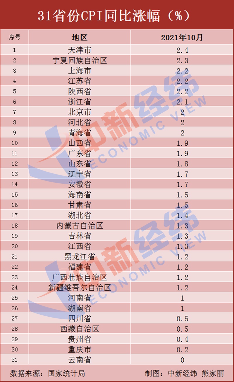 海南、甘肅兩省份10月CPI漲幅與全國持平,均為1.5%。天津、寧夏、上海、江蘇、陝西、浙江、北京、河北、青海、山西、廣東、山東、遼寧、安徽14省份10月CPI漲幅略高於全國平均水平。