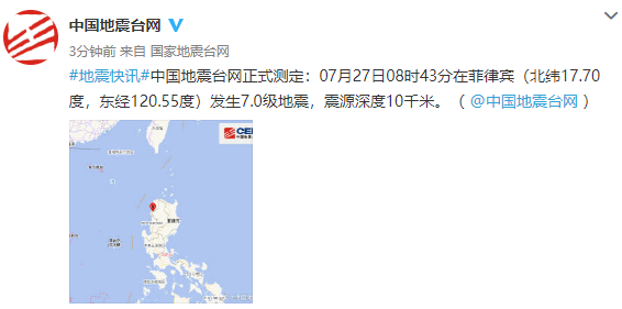 中國地震台網正式測定:7月27日8時43分在菲律賓(北緯17.70度,東經120.55度)發生7.0級地震,震源深度10千米。