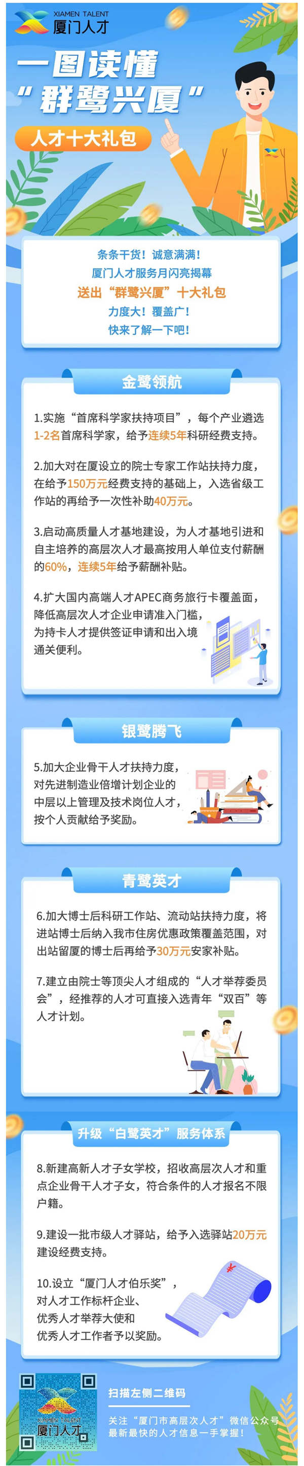 圍繞“金鷺領航”“銀鷺騰飛”“青鷺英才”“白鷺英才”服務體係等推出十條政策“幹貨”,以高質量人才服務助推五洲四海的優秀人才在廈騰飛,向全社會發出引育人才、服務人才、禮遇人才的宣言。