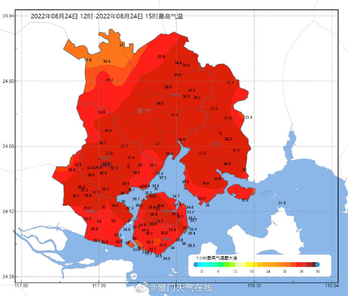 09時41分,廈門市氣象台繼續發布高溫橙色預警信號:預計今天我市仍將出現高溫天氣,思明區、湖裏區的部分鎮街最高氣溫可達35~37℃,局部可超過37℃,集美區、海滄區的部分鎮街最高氣溫可達36~38℃,局部可超過39℃。