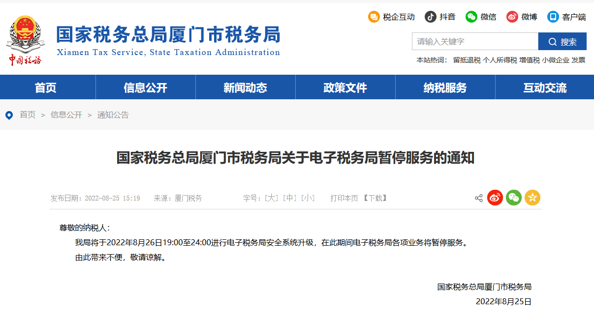 國家稅務總局廈門市稅務局關於電子稅務局暫停服務的通知