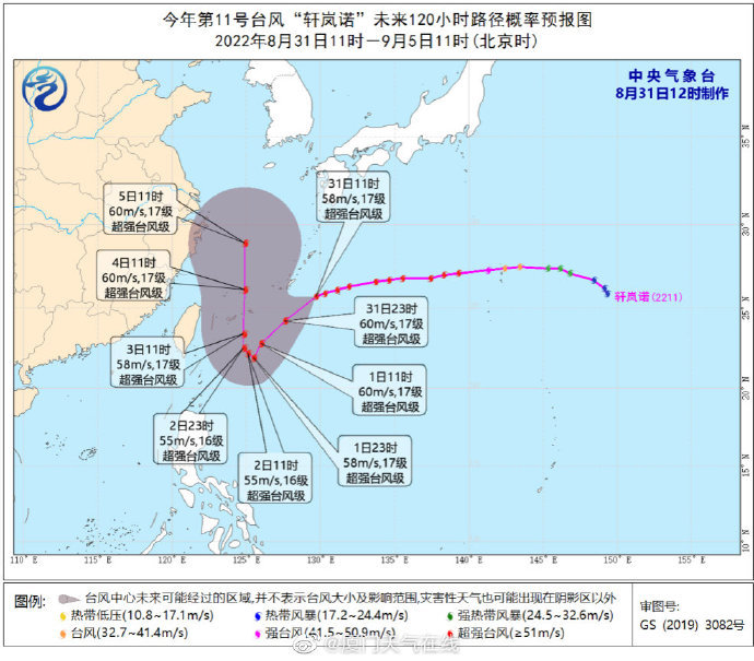 廈門網訊(廈門日報記者 朱道衡)今年第11號台風“軒嵐諾”(超強台風級)的中心今天(31日)上午11時位於日本衝繩縣那霸市東偏南方向約210公裏的西北太平洋洋麵上(北緯25.7度、東經129.7度),中心附近最大風力17級(58米/秒),中心最低氣壓為925百帕,七級風圈半徑220~230公裏。