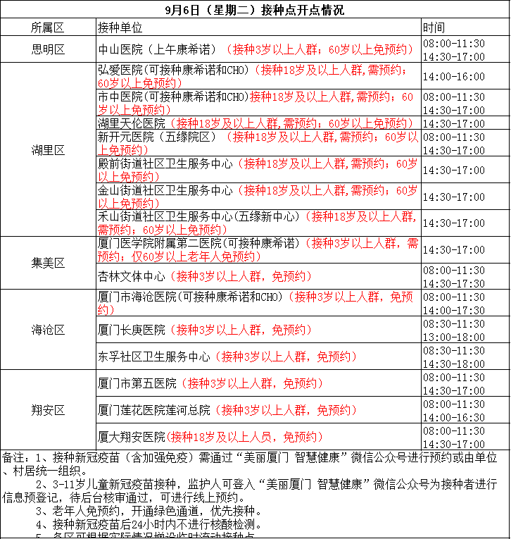 廈門網訊(廈門日報記者 陳蓴)9月6日,廈門有16個疫苗接種點提供新冠疫苗接種服務。接種新冠疫苗(含加強免疫)需通過“美麗廈門智慧健康”微信公眾號進行預約或由單位、村居統一組織。3-11歲兒童新冠疫苗接種,監護人可登錄“美麗廈門智慧健康”微信公眾號為接種者進行信息預登記,待後台審核通過,可進行線上預約。老年人免預約,開通綠色通道,優先接種。