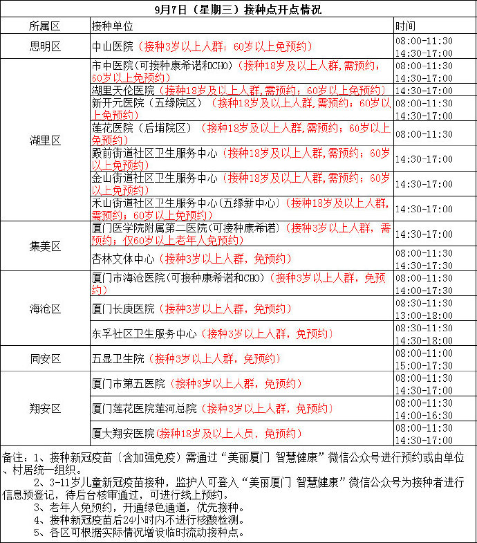 9月7日廈門新冠疫苗接種點公布