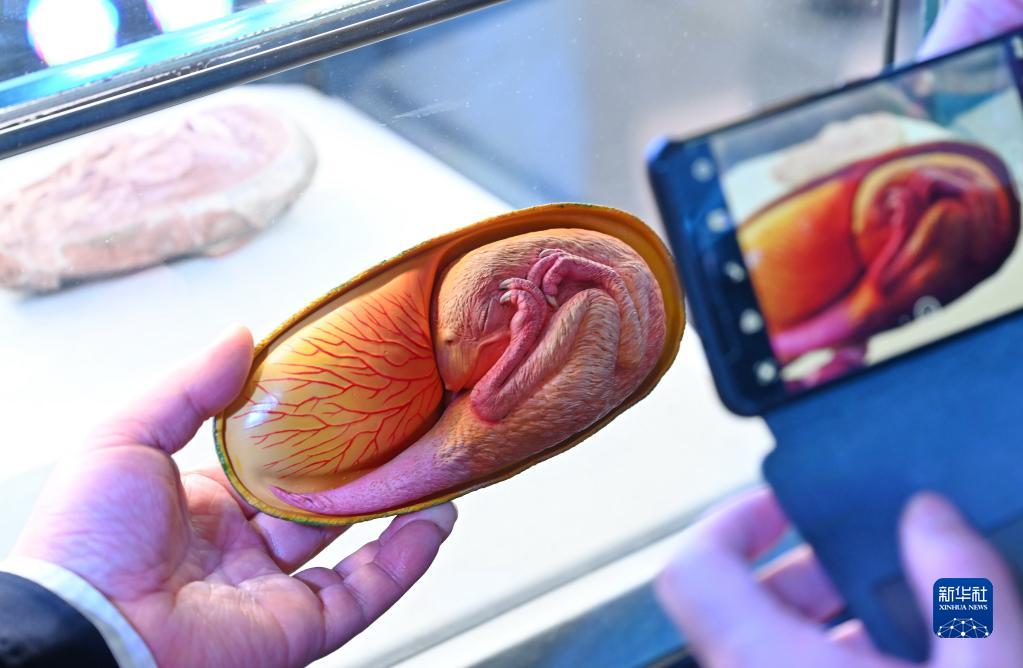 12月22日,參觀者在福建省科技館拍攝恐龍蛋化石和模型。新華社記者林善傳攝