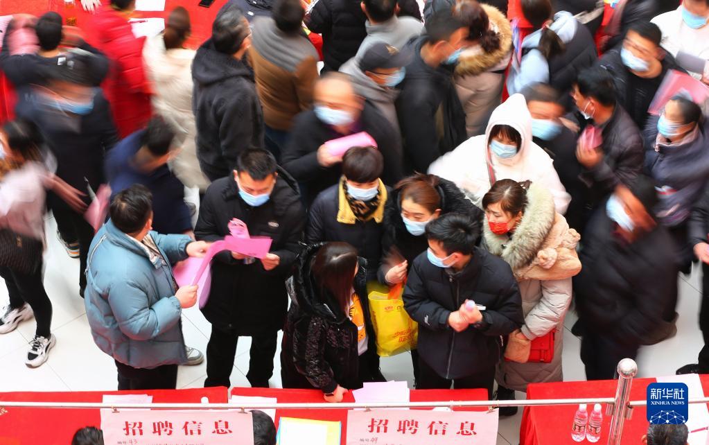求職人員在山東省滕州市“春風送崗”春季人才招聘會上尋找就業崗位(2022年2月19日攝)。新華社發(李誌軍攝)