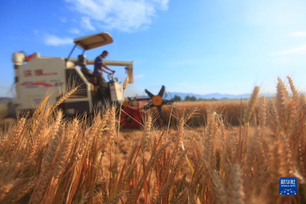 山東省臨沂市平邑縣農民駕駛收割機在田間收獲小麥(2021年6月8日攝)。新華社發(武紀全攝)