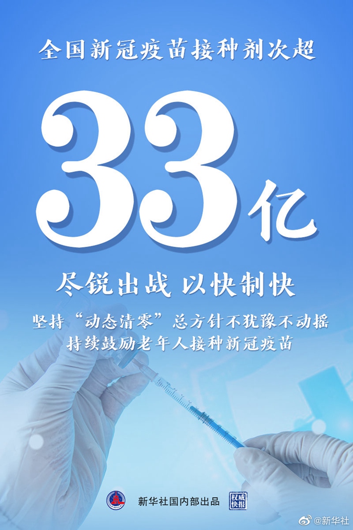 國家衛健委4月12日通報,全國新冠疫苗接種劑次超33億。當前疫情仍在高位運行,要盡銳出戰,以快製快,堅持“動態清零”總zong方fang針zhen不bu猶you豫yu不bu動dong搖yao。專zhuan家jia表biao示shi,接jie種zhong新xin冠guan疫yi苗miao可ke有you效xiao降jiang低di老lao年nian人ren重zhong症zheng和he死si亡wang風feng險xian,呼hu籲xu符fu合he接jie種zhong條tiao件jian的de老lao年nian人ren及ji時shi按an程cheng序xu完wan成cheng全quan程cheng接jie種zhong和he加jia強qiang免mian疫yi。(記者徐鵬航,海報設計喬昕)