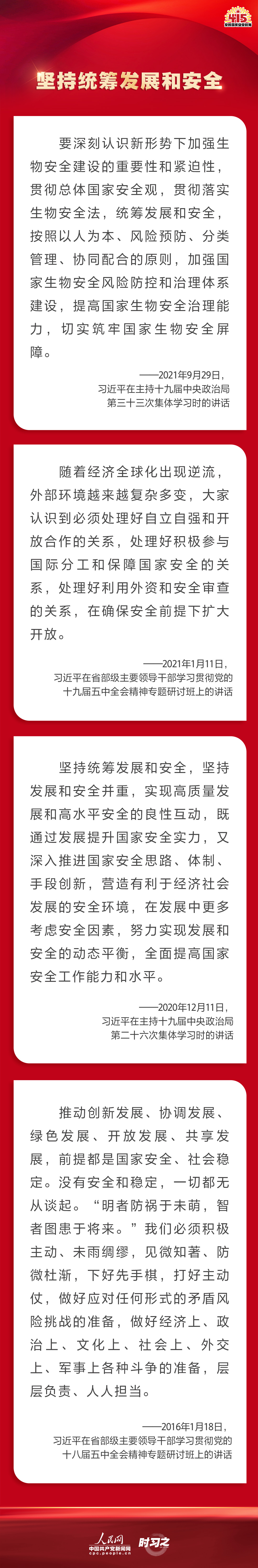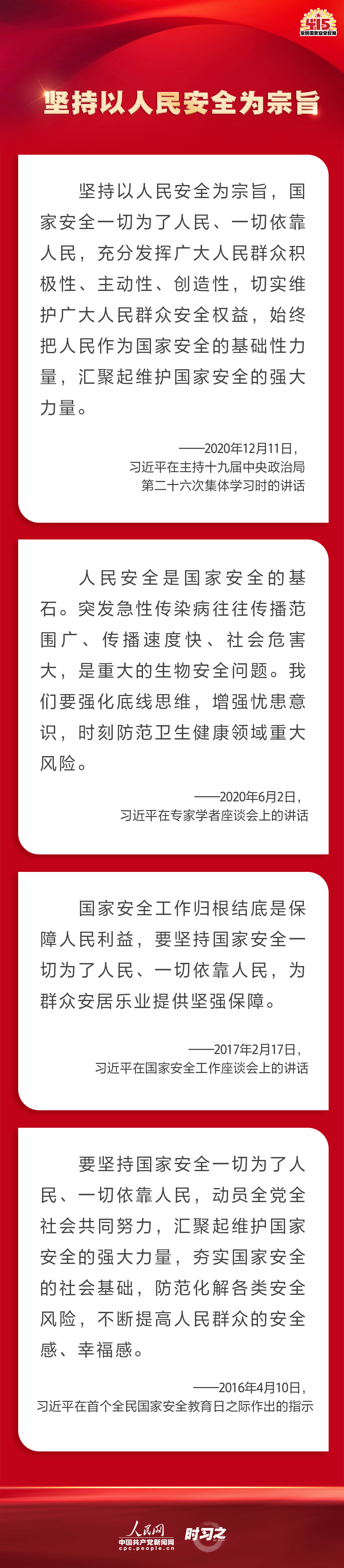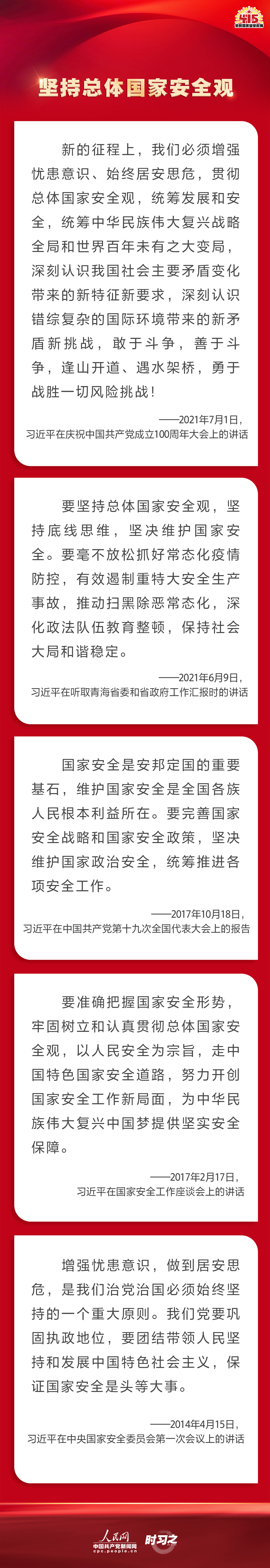 備豫不虞,為國常道。實現中華民族偉大複興的中國夢,保證人民安居樂業,國家安全是頭等大事。2022年4月15日是第七個全民國家安全教育日,讓我們一起回顧習近平總書記在不同場合就維護、築牢國家安全觀發表的一係列重要論述,增強維護國家安全的責任感、使命感、緊迫感。